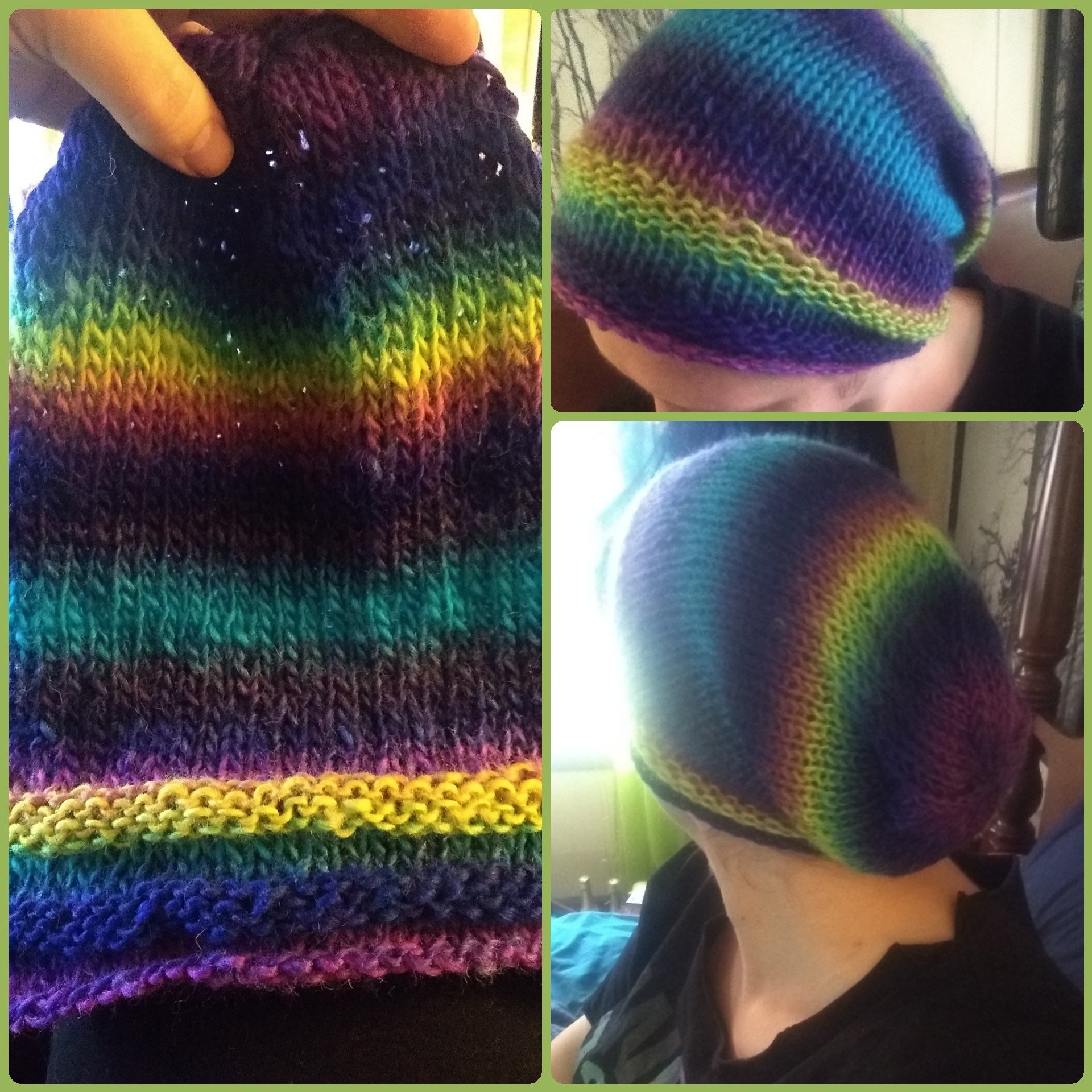 A soft yet durable silky, acrylic fiber yarn stitched into a warm slouchy hat. Each hat is made to order. The rainbow pattern is a variegated yarn ensuring that each hat boasts a unique design. A crocheted hat has looser stitches and is more breathable while a knitted hat has tighter stitches and will be slightly stretchier and warmer.