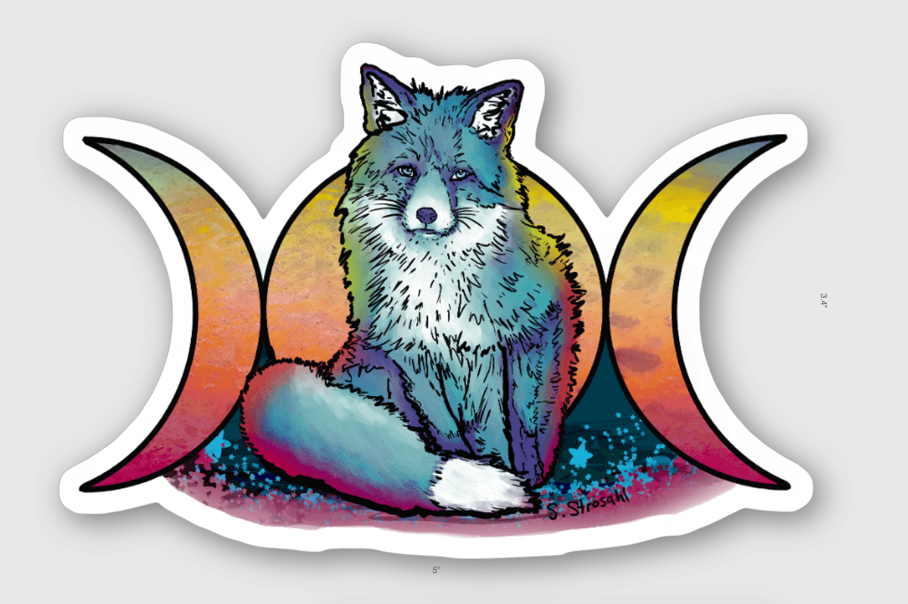 A mystical blue fox sitting with the Triple Goddess symbol. A 5 w x 3.4 h inch contour sticker.