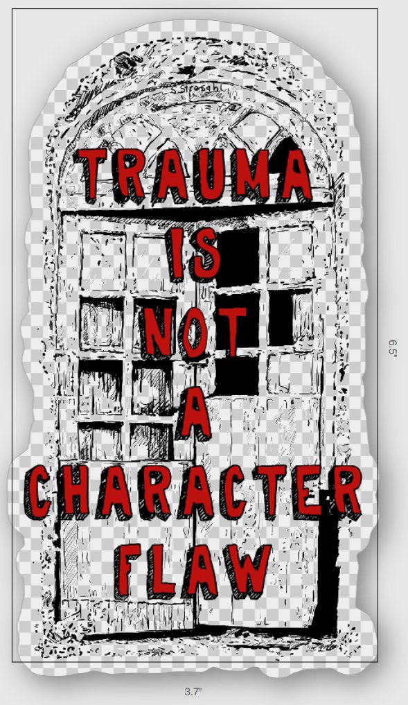 The sticker says it all: trauma is not a character flaw. A 3.7 w x 6.5 h inch clear, contour sticker.
