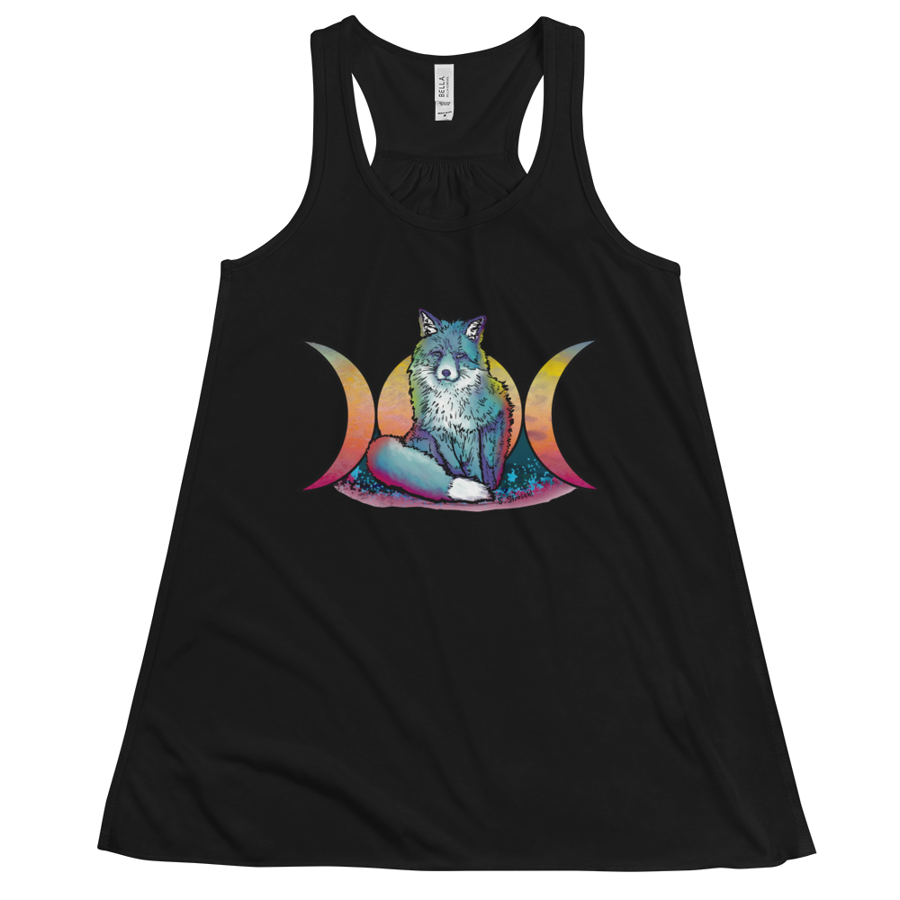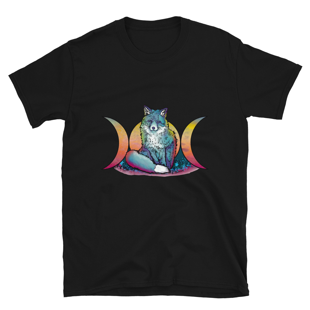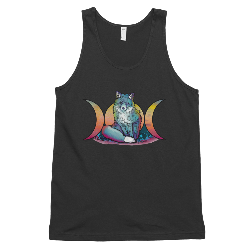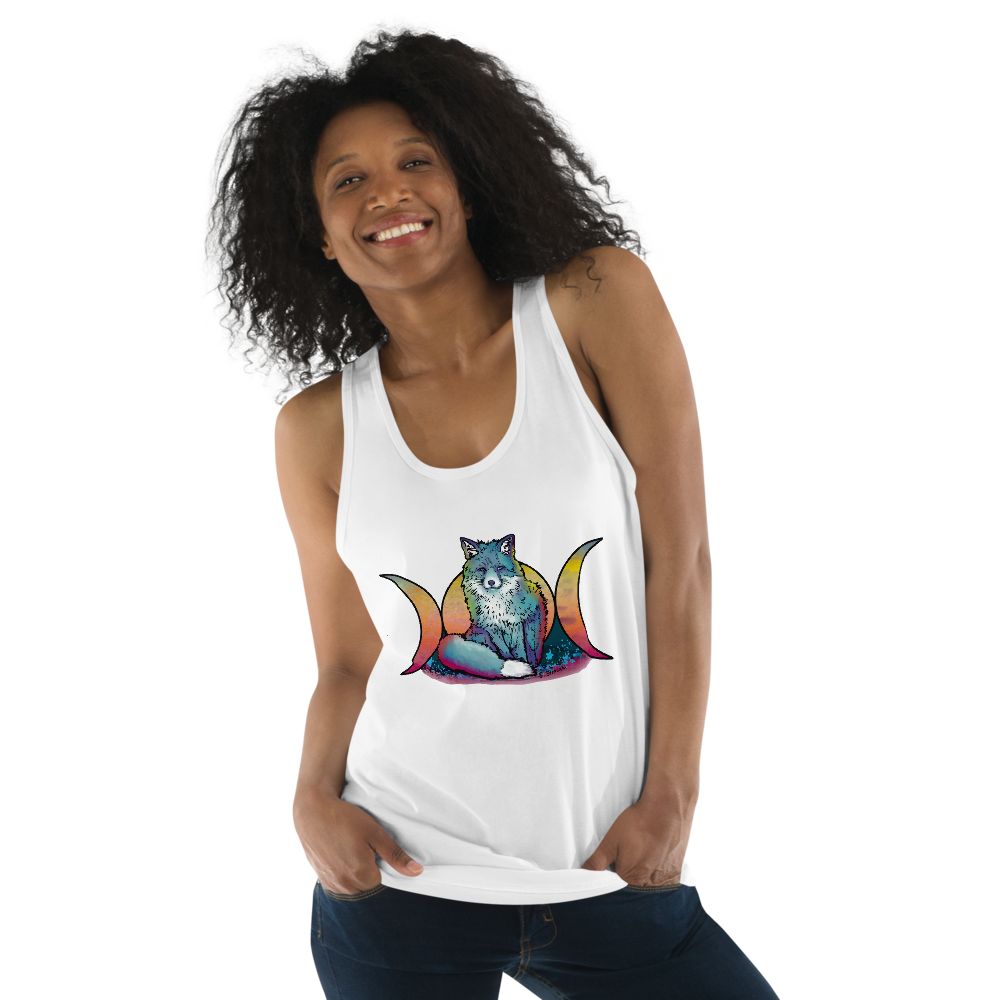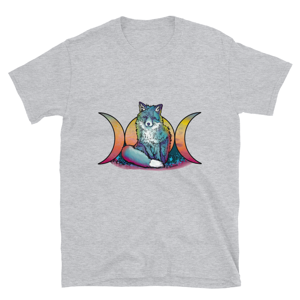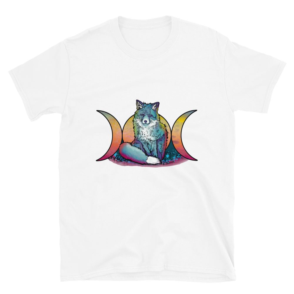 A mystical blue fox sitting with the Triple Goddess symbol.